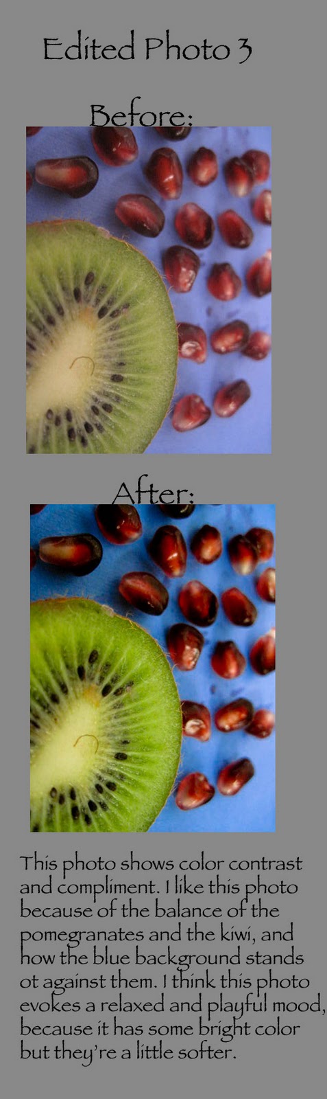 This was my square format photo, but it also shows filling the frame. I really like this photo because of the way the peppers fit into a square format: there isn't any blank space and it works well with it. I also like how the only pepper that isn't cut off is in the bottom left corner, almost like rule of thirds and it gives a good balance to the photo. I also like how the colors, how it's varying shades of yellow.